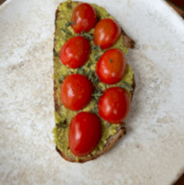 Kızartılmış ekşi mayalı ekmek üzerine avokadolu, zeytinyağlı, cherry domatesli lezzet.