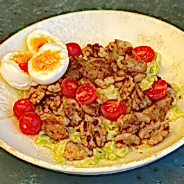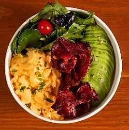 Mevsiminde toplanılan Akdeniz yeşillikleri, taze çiftlik yumurtası, avokado, cheddar peyniri ve kıtır soğanı ile balzemik soslu dana baconlu lezzet.