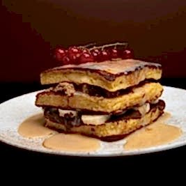 Yumurtalı ekmek arasında, nutella, fıstık ezmesi, muz, süt reçeli, tarçın, pudra şekeri ve taze kırmızı orman meyvelerinden oluşan 3 katlı lezzet şöleni.