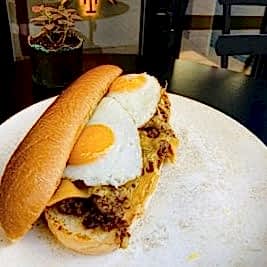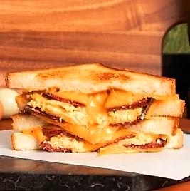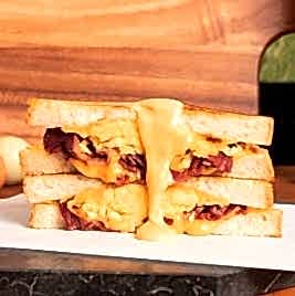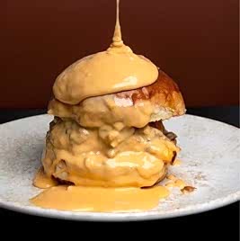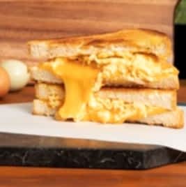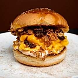 Yumuşacık enfes Fransız brioche ekmeğiyle; taze çiftlik yumurtası, cheddar peyniri, karamelize soğan, orijinal sosu ve soğan kıtırı üzerinde 3 peynir karışımından oluşan nefis peynir soslu akışkan lezzet. Patates cipsi eşliğinde servis edilir.