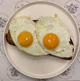 Kızartılmış ekşi mayalı ekmek üzerine sahanda taze çiftlik yumurtası.