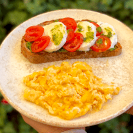 Kızartılmış ekşi mayalı ekmek üzerine çırpılmış taze çiftlik yumurtası.
