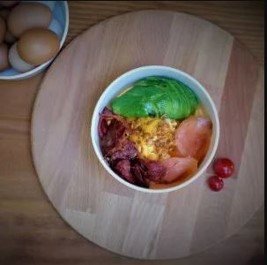 Taze çiftlik yumurtası, avokado, cheddar peyniri ile dana bacon ve somon fümeli ketojenik lezzet.